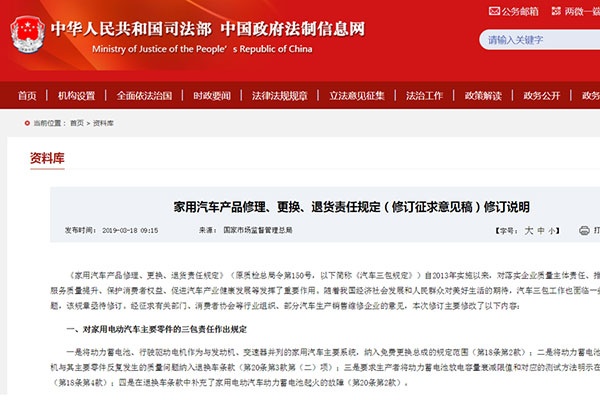 3月14日,國(guó)家市場(chǎng)監(jiān)督管理總局發(fā)布《家用汽車(chē)產(chǎn)品修理、更換、退貨責(zé)任規(guī)定》(修訂征求意見(jiàn)稿),意見(jiàn)稿將家用電動(dòng)汽車(chē)的動(dòng)力總成和主要零件納入汽車(chē)“三包”責(zé)任,特別是電池或電機(jī),如果發(fā)生嚴(yán)重質(zhì)量問(wèn)題可退換車(chē),譬如電池起火等。